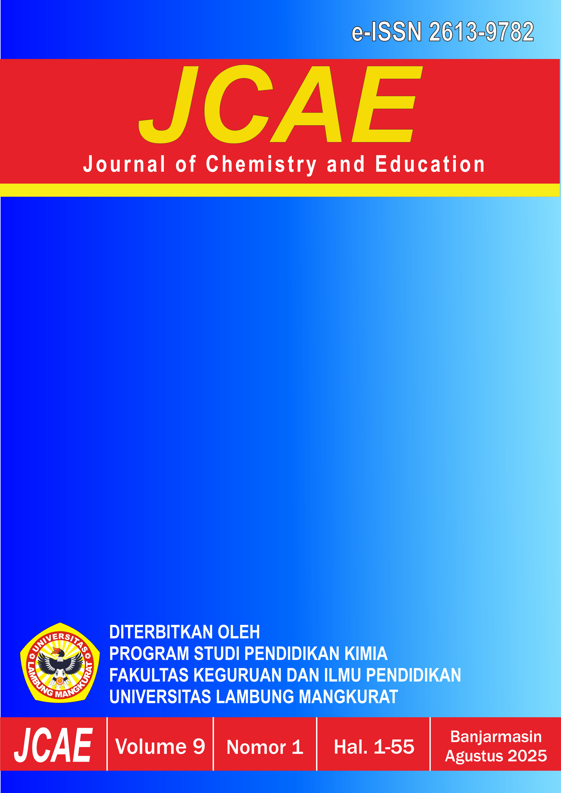 JCAE (Journal of Chemistry and Education) merupakan jurnal yang diterbitkan oleh Program Studi Pendidikan Kimia FKIP Universitas Lambung Mangkurat, yang berisi artikel hasil penelitian tentang pendidikan dan pembelajaran dalam bidang kimia serta penelitian kimia yang meliputi kimia analitik, kimia organik, biokimia, kimia anorganik serta kimia fisik.